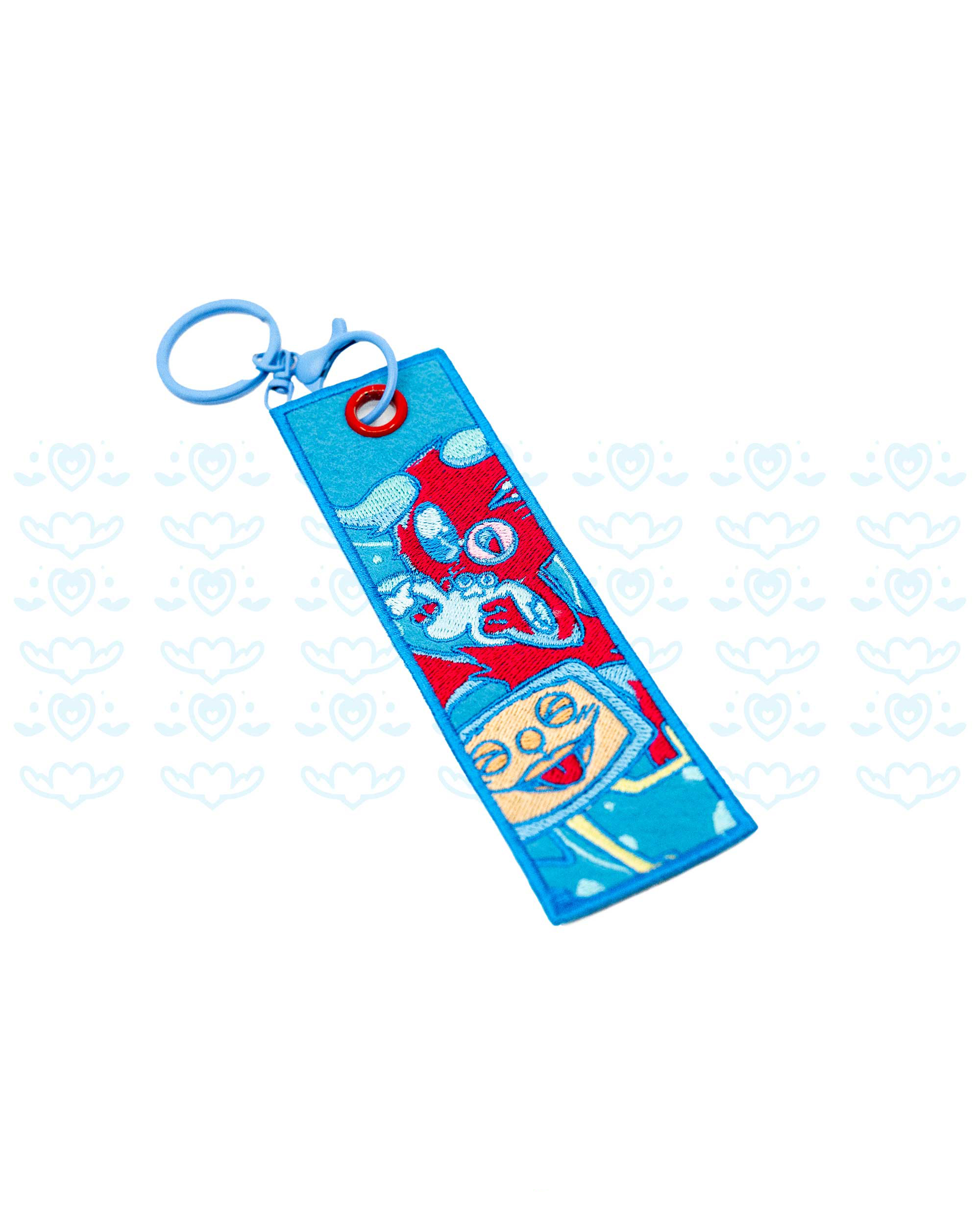 An embroidered keyring that adds a charming touch to bags, wallets, and more. Jujubee and Toto are intricately crafted with durable embroidery, showcasing luxurious details. The blue-colored wire ring features a screw mechanism for easy attachment and removal.