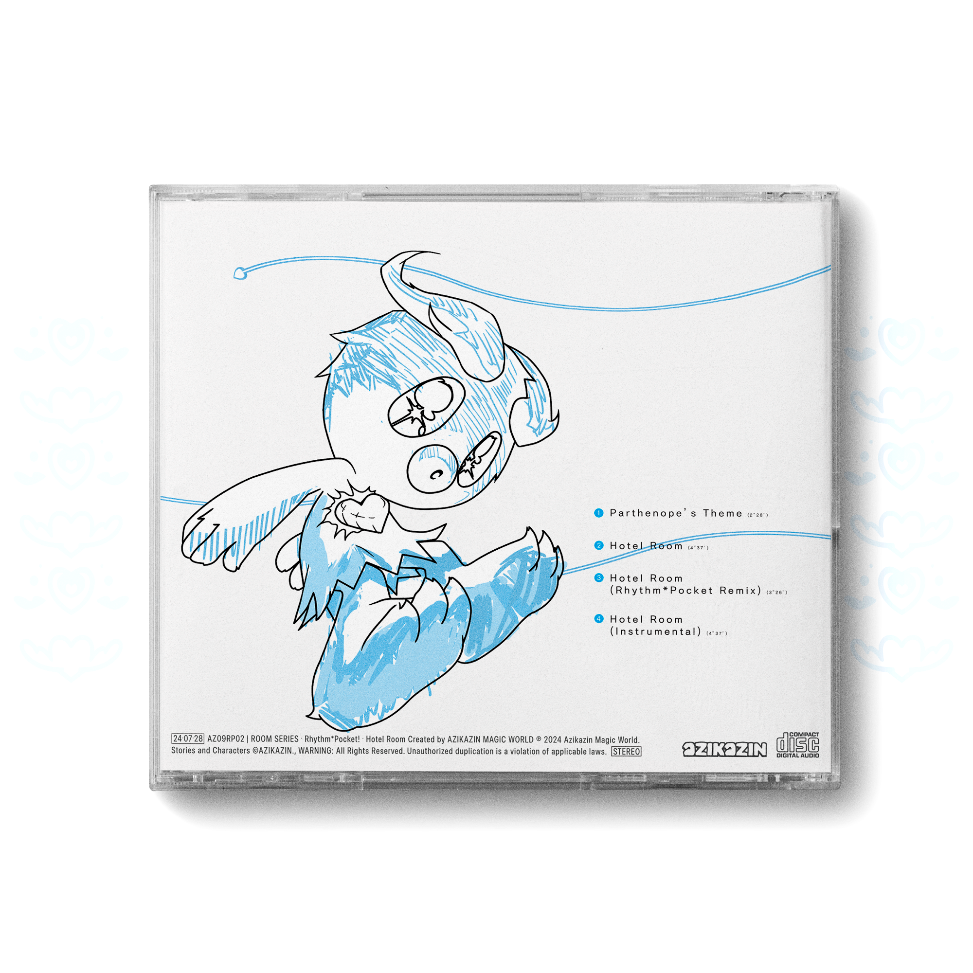 Azikazin Magic World의 미니 앨범 「Hotel Room」의 실물 음반입니다. 투명한 쥬얼 케이스 속에는 세상에 처음 등장한 트라→키즈! 멤버들이 주인공 주주비와 함께 어딘가로 향하는, 왠지 모르게 시원섭섭한 분위기의 일러스트가 소중히 담겨 있습니다. 이 앨범은 떠나고, 그리워하고, 꿈꾸는 순간을 건넵니다.