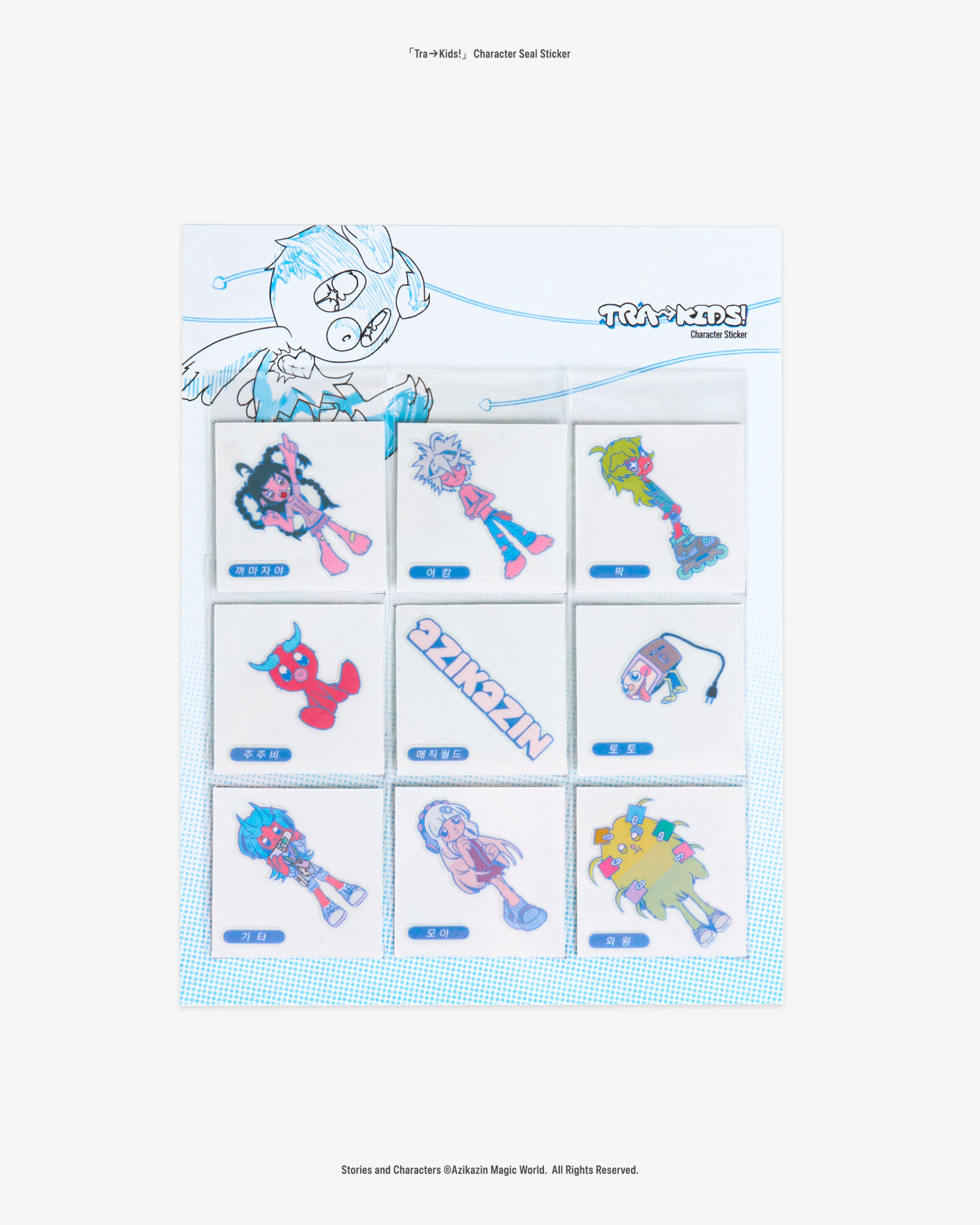 트라→키즈!를 한번에 만나볼 수 있는 스티커 세트입니다. Azikazin Magic World의 로고를 포함한 총 9종의 스티커가 한 세트이며, 원하는 곳에 쉽게 붙였다 떼어낼 수 있는 씰 스티커 방식으로 제작되었습니다.